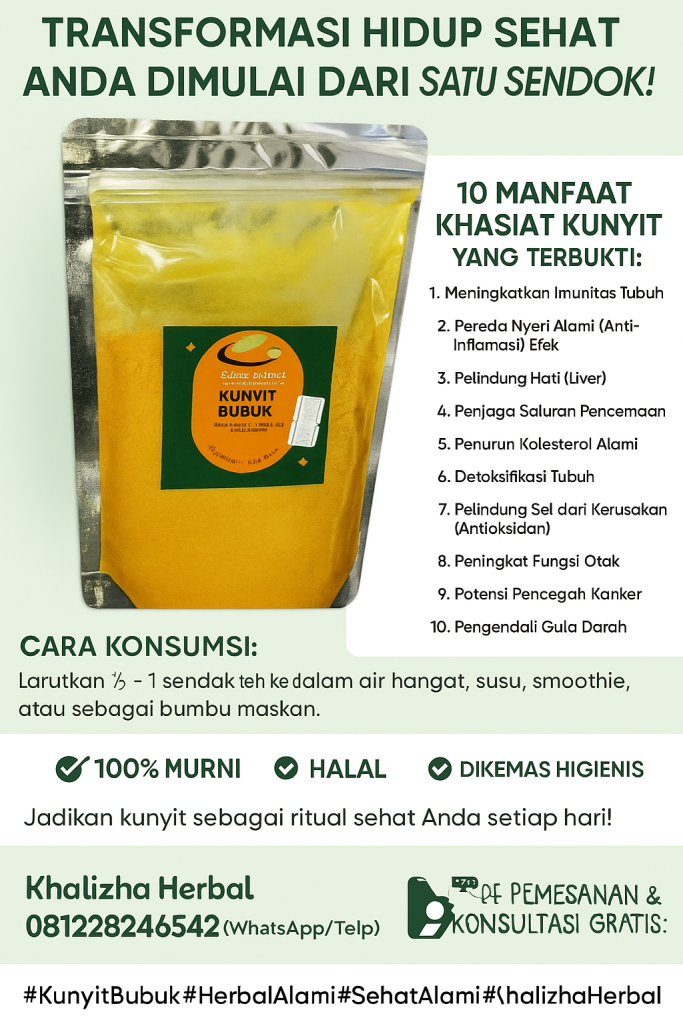 Perkenalkan Kunyit Bubuk Murni Premium dari Khalizha Herbal. Diproses secara alami dari kunyit pilihan terbaik, dikeringkan dengan teknologi tepat guna dan dihaluskan tanpa tambahan bahan kimia. Setiap 150 gram kemasan berisi kebaikan alam paling murni untuk mendukung kesehatan harian Anda.