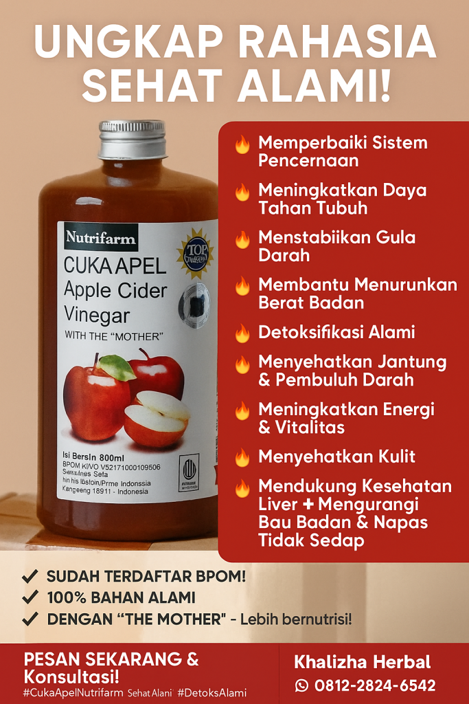Rasakan kekuatan alam dalam setiap tetesnya! Cuka apel premium dengan kandungan “The Mother” yang kaya enzim, probiotik, & mineral alami untuk kesehatan optimal Anda.
