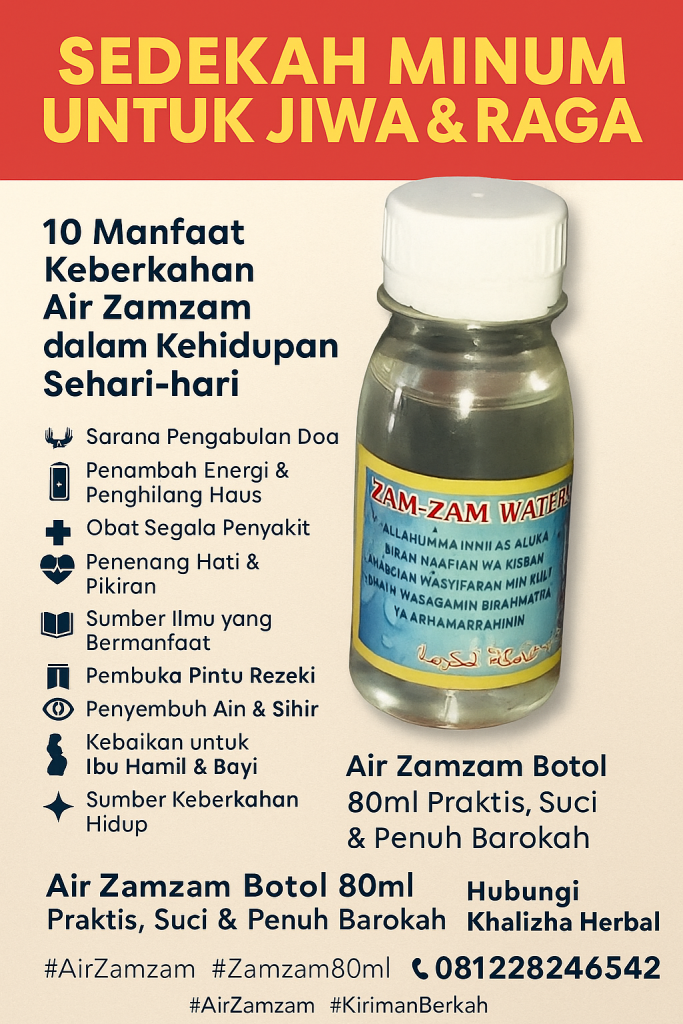 1. 💧 Sarana Pengabulan Doa: Minumlah dengan penuh keyakinan dan niat, karena Air Zamzam adalah air yang mustajab untuk memohon segala hajat kepada Allah SWT.