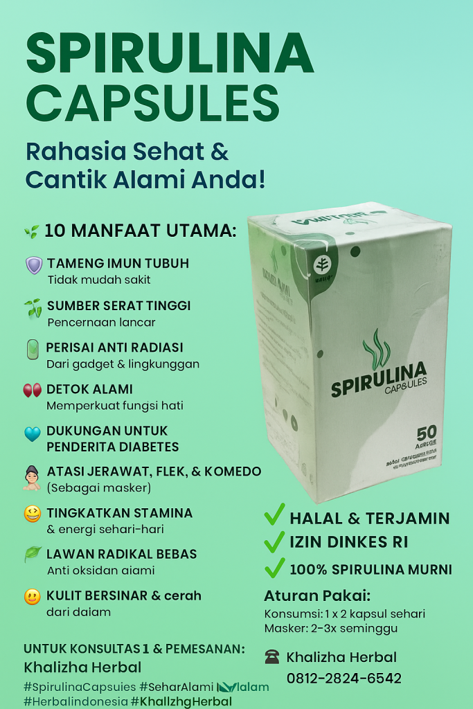 Hidup sehat dan kulit bersih jadi impian? Kini hadir SPIRULINA CAPSULES, suplemen alami dari 100% Spirulina murni yang telah mendapat Izin Dinkes RI dan Sertifikasi HALAL MUI.