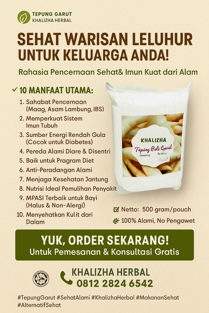 Bingung cari alternatif tepung yang ramah di pencernaan dan penuh manfaat? TEPUNG GARUT KHALIZHA HERBAL solusinya! Diproduksi secara alami dari umbi garut pilihan, cocok untuk semua usia – dari bayi mulai MPASI hingga lansia.