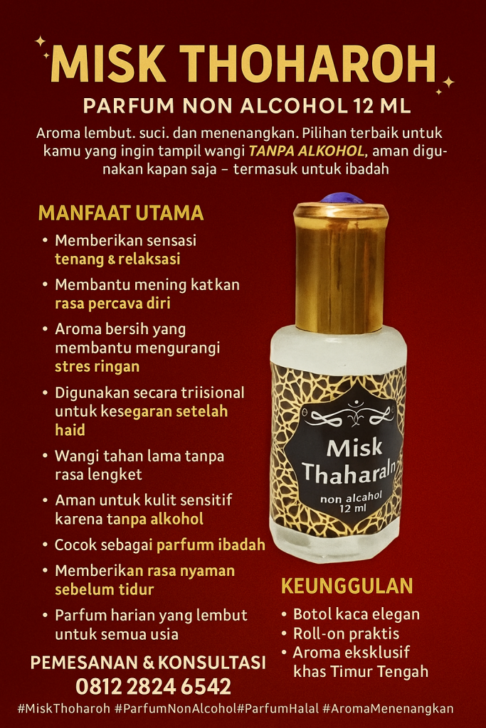 > Catatan: manfaat di atas adalah manfaat tradisional/umum dari minyak wangi non-alkohol, bukan klaim medis.