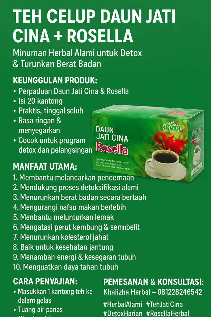 ✨ Perpaduan daun jati cina & rosella menjadikan teh ini pilihan tepat untuk Anda yang ingin hidup lebih sehat dengan cara yang aman, praktis, dan alami.